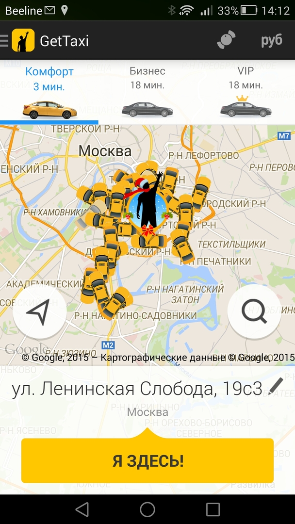 Этот сервис ориентирован в первую очередь на тех, кому нужно поехать прямо сейчас, борется за минимальное время подачи и вообще представляет собой лучшую альтернативу «бомбилам». В ценах им, правда, сильно проигрывает. Собственных машин у GetTaxi нет, водителей набирают из персонала таксопарков, но каждого кандидата аттестуют самостоятельно, причём проверка включает не только вопросы на знание города, но и диктант. Что, увы, не спасает от гостей из южных республик, очень плохо говорящих по-русски (ах, как бывает жаль навигаторы, которым они диктуют адрес).
