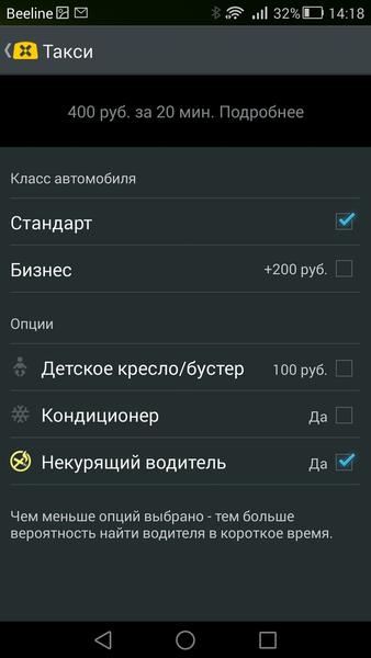 Цена всегда едина и меняется только в зависимости от времени суток. К сожалению, платить пока можно только наличными. Ну, или бонусами, которые накапливаются с каждой поездкой. Из дополнительных опций есть только «некурящий водитель» (что в действительности значит лишь «не курящий при вас водитель»), кондиционер и детское кресло. Интересно, что для машин бизнес-класса не предусмотрен отдельный тариф, вместо этого к сумме прибавляются фиксированные 200 рублей.