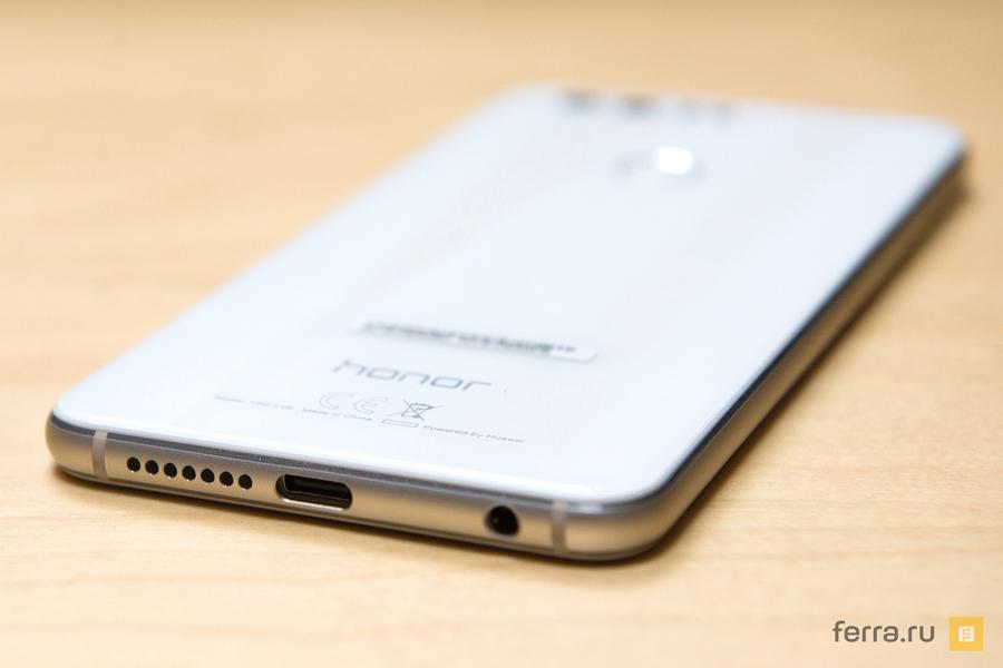 Вместо привычного microUSB на нижнем торце находится порт USB-C, который оказался несколько туговат. В других смартфонах, с которыми я имел дело (HTC 10, например) кабель входил плавно и четко – ощущения были ровно теми же, что и при использовании Lightning с устройствами Apple. Но в случае с Honor 8 сложно удержаться от пошлых шуток.