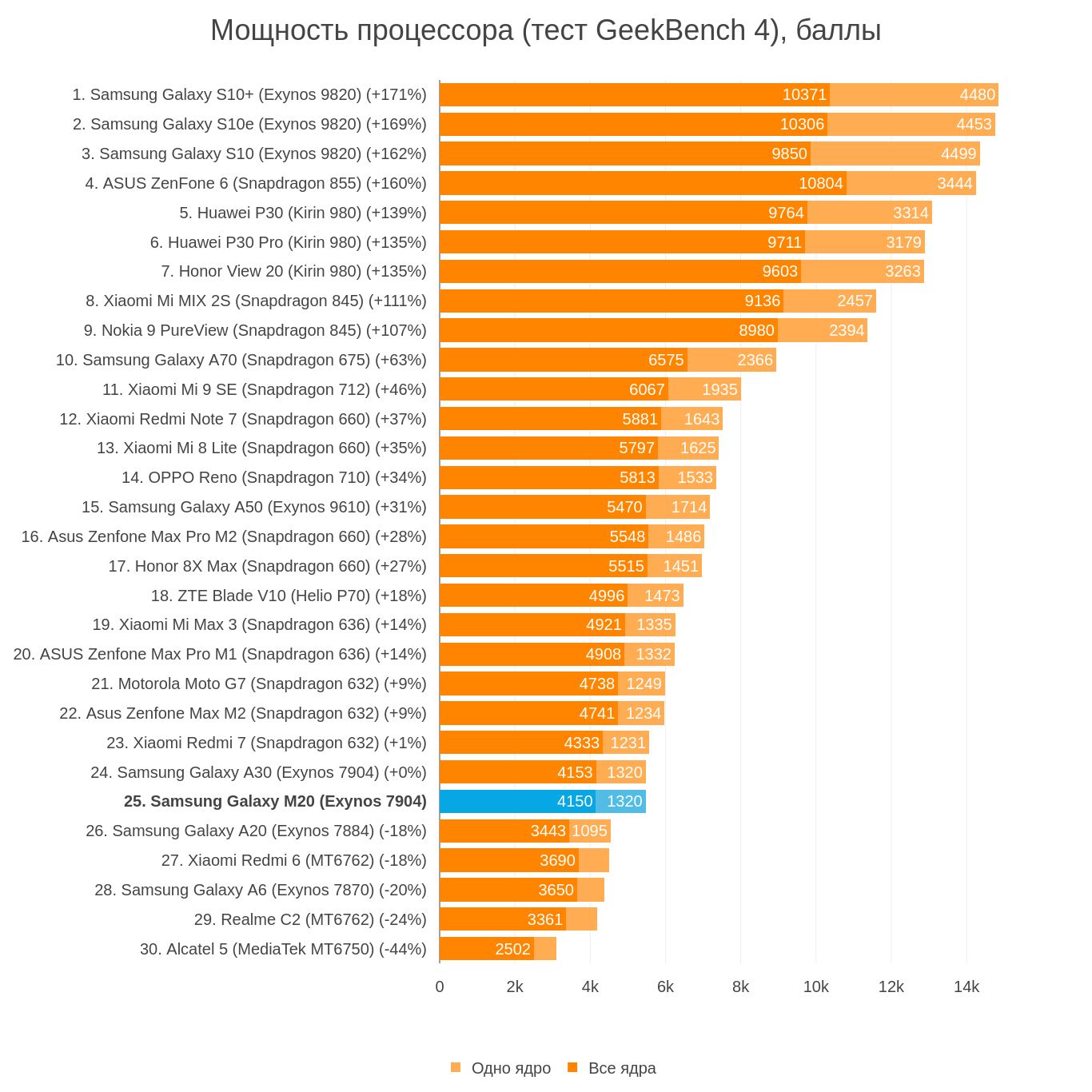 В Galaxy M20 компания вновь использует собственный процессор, Exynos 7904. По уровню производительности он находится примерно на уровне Qualcomm Snapdragon 632. Неплохой результат в целом. Возможно, использование полностью собственного “железа” позволило Samsung отлично оптимизировать смартфон. Интерфейс работает так же плавно, как у флагманов - пользоваться Galaxy M20 очень приятно. И я не могу объяснить, почему, но M20 работает быстрее, чем Galaxy A30 с таким же процессором и аналогичной версией Android. То, что M20 был быстрее, чем A30, с "восьмёркой" - факт, но удивительно, что отрыв сохранился даже после смены версии системы.