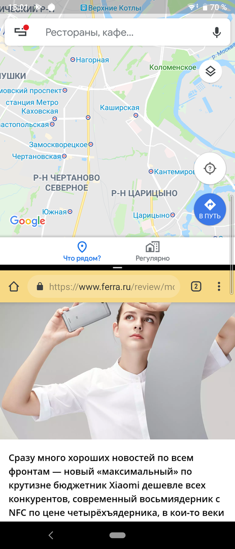 Ещё в Xperia 10 Plus можно разделить экран, чтобы отобразить сразу два приложения. При таком формате это в целом полезно, хотя тут внезапно открывается, что не хватает ширины - из-за этого не получается сделать удобный для чтения масштаб. Так что удобнее всего пользоваться разделённым экраном в горизонтальном формате.