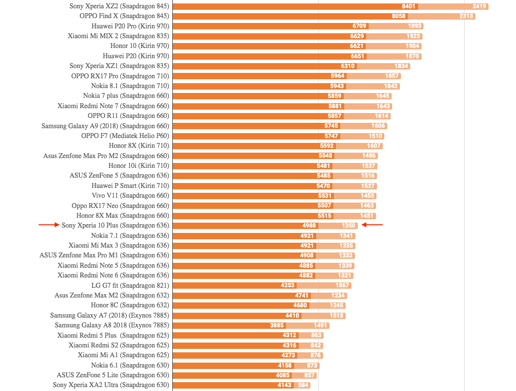 В общем, получается забавно. По тестам производительности Sony Xperia 10 Plus находится среди смартфонов, у которых упор обычно делается не на процессор, а на ёмкую батарейку. А по автономности - среди бюджетников.