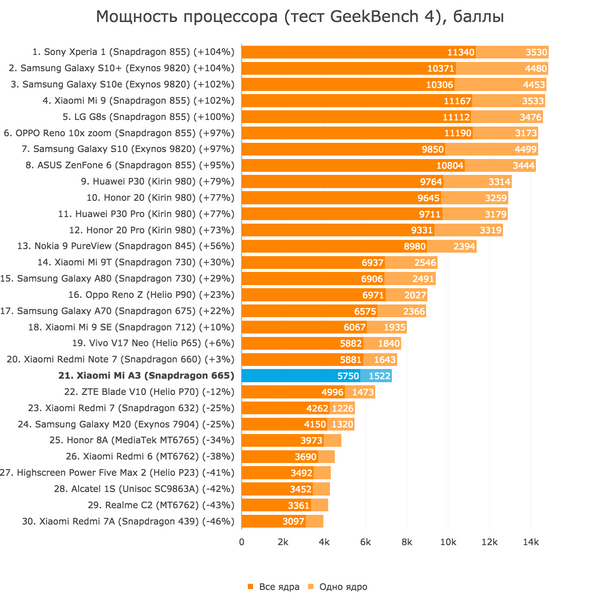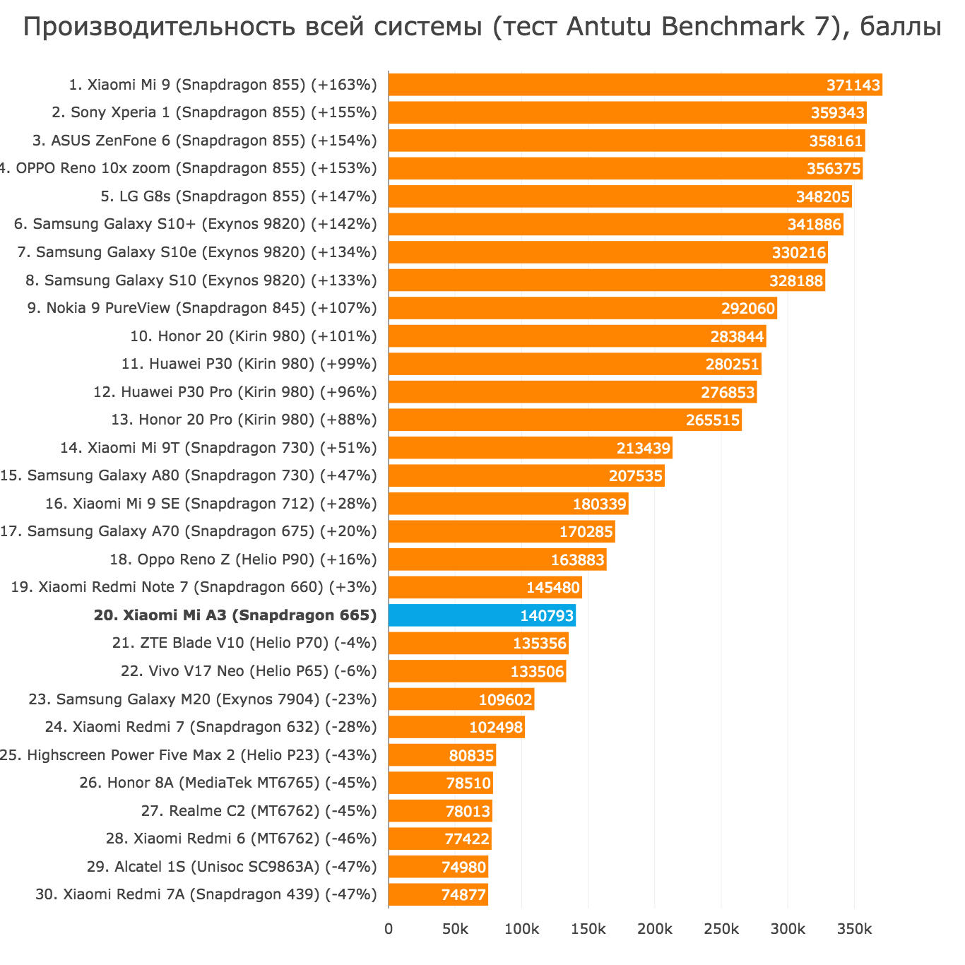 Приятно видеть, что Snapdragon 665 по уровню производительности приблизился к уже относительно старым 710. Да, хотелось бы ещё более мощного процессора, как в Mi 9T, например - в недавнем прошлом отличительной особенностью Mi A2 в сравнении с Redmi Note 6 Pro был как раз чуть более быстрый процессор. Но и с 665-м "снапом" Xiaomi Mi A3 держится неплохо.