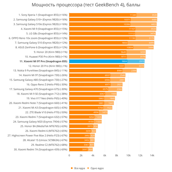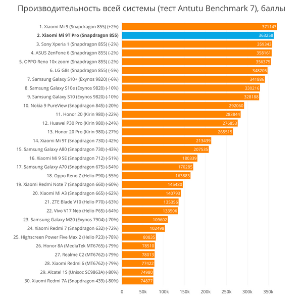 Всё! Дальше в топе выносливости остаются только смартфоны на «обрезанных» по производительности процессорах. Уже за это Mi 9T Pro нужно строить памятник нерукотворный! Ну или награду «Выбор редакции», как в нашем случае.