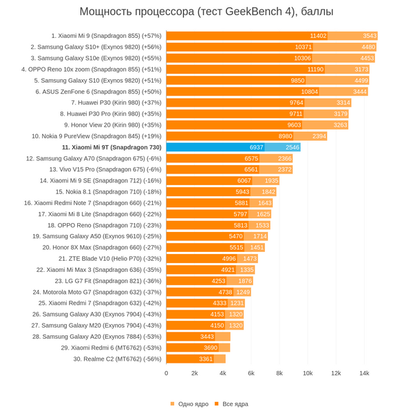 В отличие от недавнего Mi 9 SE, Mi 9T построен на более свежем процессоре - Qualcomm Snapdragon 730. В сравнении с Snapdragon 710-712, которые нам знакомы по Nokia 8.1, Xiaomi Mi 9 SE и Meizu 16, этот CPU разогнан по процессорной и графической части, поддерживает новый стандарт Wi-Fi версии 6 (если производитель влепит такой модуль, а не сэкономит и оставит старьё) и умеет записывать видео в 4K HDR. То есть, переварит даже камеры уровня Sony Xperia 1 или Samsung Galaxy S10+, чего раньше процессорам среднего класса было не позволено.