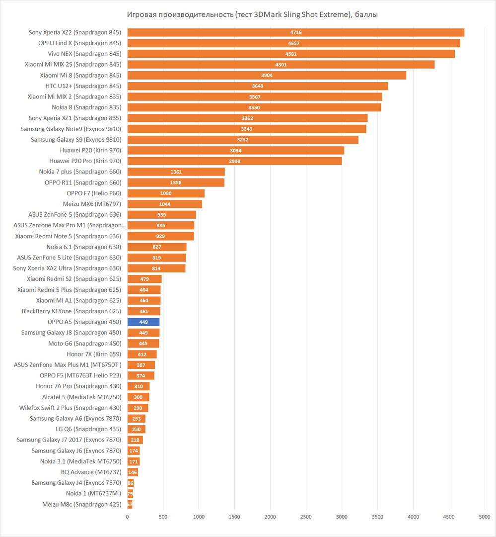 Такие чудеса в бюджетном китайфоне складываются из многих вещей. Во-первых, очень ёмкий аккумулятор — 4230 мАч. Во-вторых, ColorOS очень агрессивно душит все приложения, чтобы ни дай бог никто не «воровал» заряд батареи, в-третьих — низкое разрешением экрана (= меньше нагрузка на графику), в-четвёртых — самый экономичный восьмиядерный процессор среди всех, которые бывают в 2018 году.