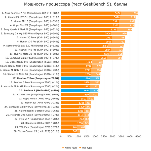 Вас не удивили габариты и экраны? А как вам такое: Realme 7 ещё и более быстрый, чем 7 Pro! Точнее, CPU в Realme 7 Pro, Snapdragon 720G, хоть и обходит MediaTek Helio G95 в Realme 7, но по производительности графики в играх уже всё ровно наоборот. И тест AnTuTu Benchmark v8, который учитывает не только CPU, но и GPU (а также производительность оперативной памяти и внутреннего накопителя) всё-таки поставил более высокий балл “обычному” Realme 7.