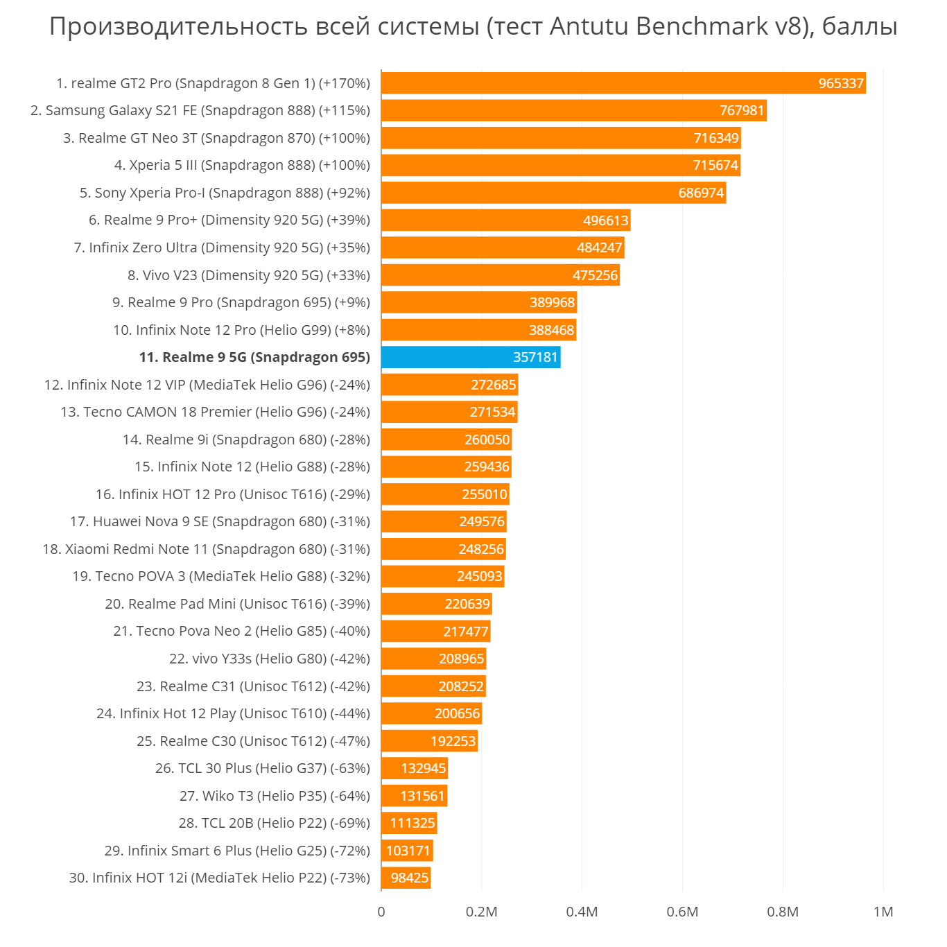 Сердце Realme 9 5G — чип Qualcomm Snapdragon 695 (состоит из двух мощных ядер Cortex-A78 по 2,2 ГГц и шести ядер Cortex-A55 по 1,7 ГГц), выполненный по техническому процессу 6 нм. Звучит это более чем обнадеживающе, учитывая, что конкурентов из класса повыше снабжают какими-нибудь MediaTek Helio G96 с 12 нм. А тут вполне себе бодрый процессор, который можно встретить, например, в более дорогих Xiaomi Redmi Note 11 Pro+ и Poco X4 Pro 5G. Последний в официальной рознице вообще стоит все 26-27 тысяч рублей и считается чуть ли не игровым.