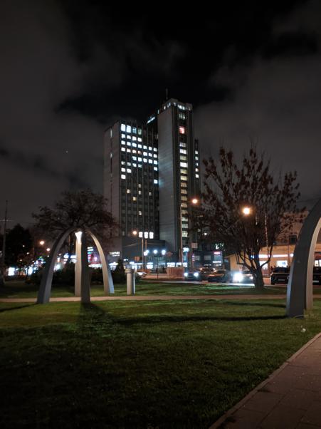 Основной и единственный не бутафорский модуль, который получил Realme 9 5G — Samsung S5KJN1 с разрешением 50 Мп, диафрагмой f/1,8 и размером пикселей 0,64 мкм. Маленькие пиксели и не самые классные алгоритмы биннинга пикселей (их объединения, чтобы на выходе у вас получались не огромные 50 Мп файлы, а скромные «жипеги» на 12 Мп), ожидаемо, дают средний результат. Ночное небо становится шумным, вокруг объектов появляются характерные ореолы от паршиво работающего встроенного в камеру HDR. Есть решение проблемы? Есть.