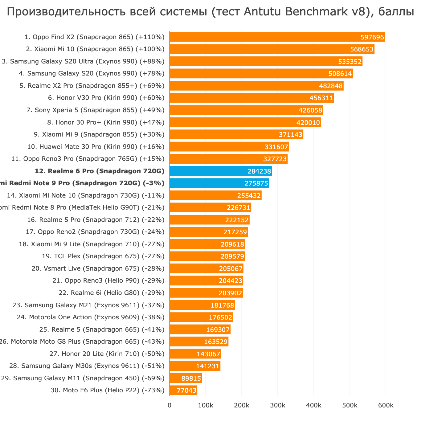 У бенчмарка AnTuTu оценка комплексная, которая включает в себя множество параметров — и скорость накопителя, и оперативную память, но и там у Redmi 9 Pro преимущество незначительное.