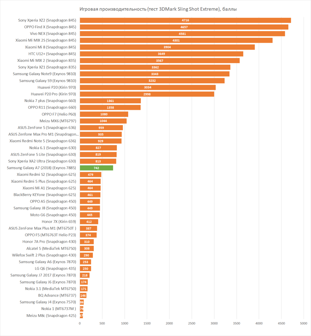 Samsung продолжает импортозамещаться с процессорами в своих смартфонах, поэтому и в А7 не вариант «по умолчанию» Qualcomm Snapdragon, а Samsung Exynos 7885 с непривычной конструкцией из шести маломощных ядрер Cortex-A53 и двух мощных, но прожорливых Cortex-A73. Как показывают бенчмарки, этот процессор отстаёт от Snapdragon 660, который можно найти в смартфон той же ценовой категории, и даже зачастую от 636-го. Понятно, что не всем нужна максимальная мощность, но ощущение, что Самсунг украл себе немного мощности по маркетинговым соображениям, всё равно остаётся. Правда, очевидных проблем с производительностью не видно, телефон более чем бодрый, и, если вы собираетесь его сменить через год-два, то до того момента бодрым, скорее всего, и останется.