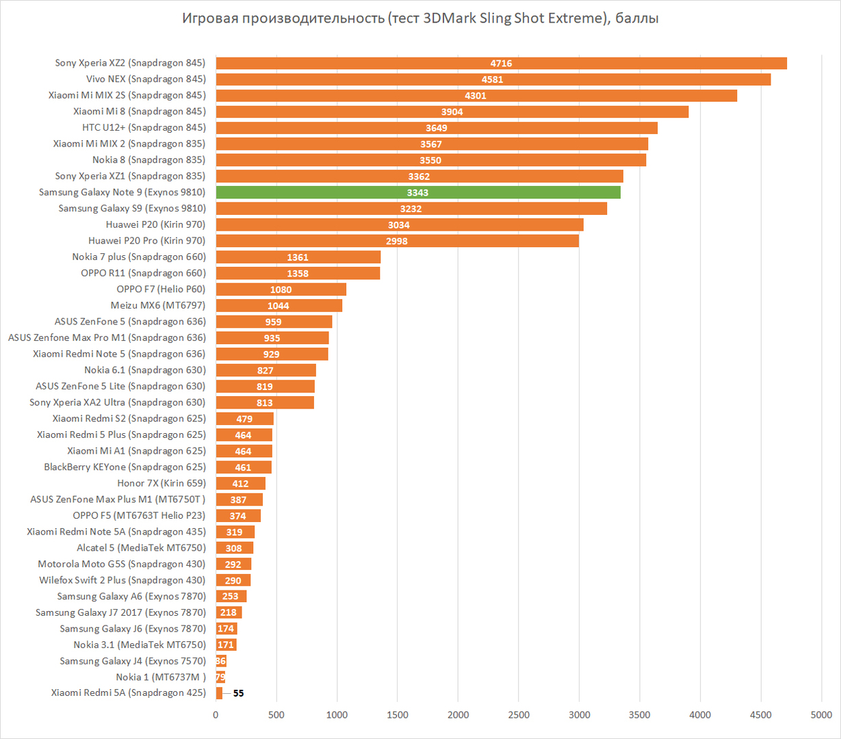 Как и прежде, Samsung выпускает свои топовые смартфоны с двумя разными процессорами для разных рынков. В России вы найдёте его с только что упомянутым Exynos 9810. И, как вы сами можете увидеть на наших диаграммах, он весьма неоднозначно выступает в сравнении с Snapdragon 845, тоже топовой SoC, которую часто можно встретить во флагманах других производителей. К примеру, в популярном игровом бенчмарке, 3DMark Sling Shot Extreme, Exynos 9810 откровенно отстаёт от конкурента, а в чисто процессорном тесте, GeekBench 4, наоборот, стал лидером в нашей таблице. Благо смартфон больше рассчитан как раз не на мобильных геймеров, хотя у них тоже проблем не должно возникнуть.