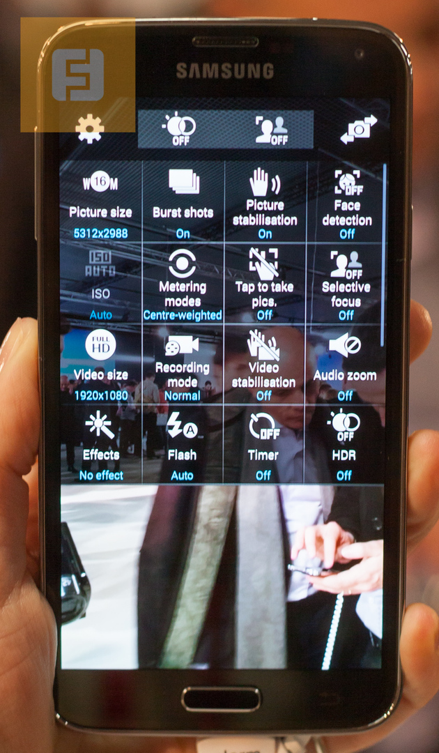 Основная камера обладает разрешением 16 мегапикселей, поддерживает функцию съемки Ultra HD видео со скоростью 30 кадров в секунду и HDR в реальном времени, как для фото, так и видео. Также предусмотрены пара новых режимов, включая Selective Focus, аналогичную Nokia Refocus Lens, для выборочной фокусировки на определенных участках снимка и размывания фона уже после съемки. По словам производителя, Samsung Galaxy S5 стал обладателем самой быстрой системы автофокусировки, которая срабатывает буквально за 0,3 секунды. Фронтальная камера получила разрешение 2,1 мегапикселя.