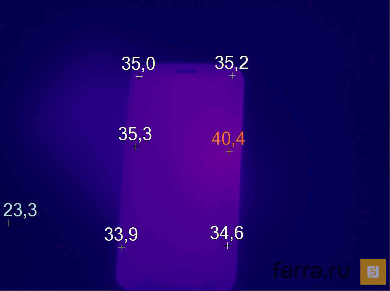 Нагрев корпуса в режиме высокой нагрузки неоднороден — передняя и задняя панель греются очень умеренно, в то время как металлическая рамка стабильно «переваливает» за 40 градусов. Это далеко не та температура, при которой смартфон хочется выпустить из рук, но, с учётом малой толщины боковых граней и того, что они — единственная «точка опоры» на скользком корпусе смартфона, ощущения в играх иной раз бывают не слишком приятными.