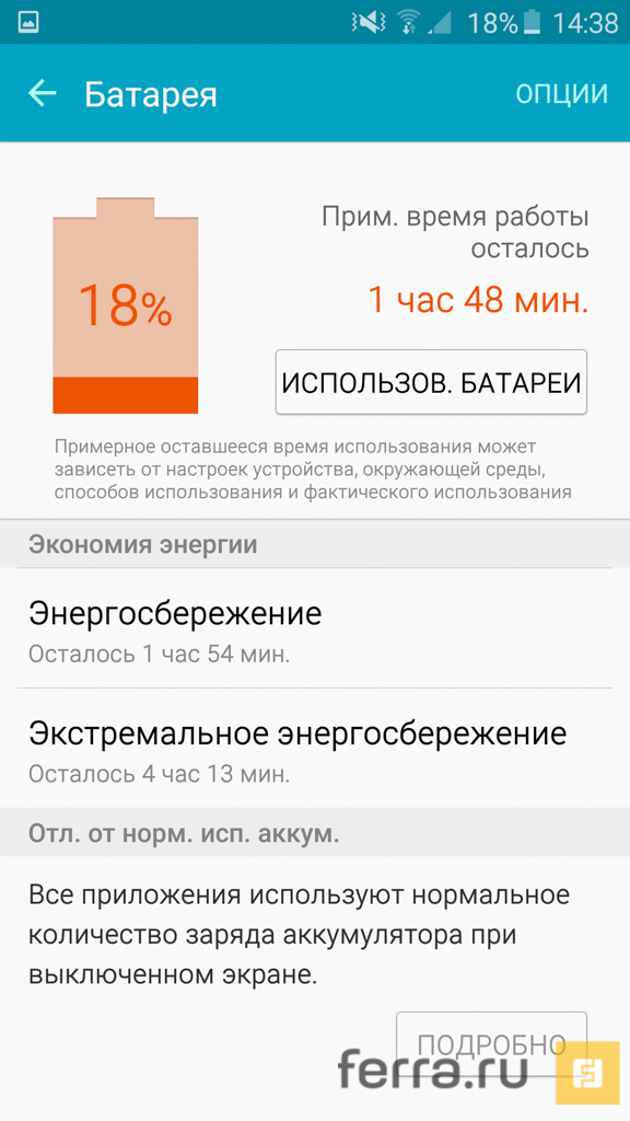 Одной из причин, по которой Samsung решился перевести процессор S6 edge на 15-нм «рельсы», стало увеличение автономной работы. Учитывая уменьшенную на 200 мАч ёмкость аккумулятора и сопутствующие опасения покупателей, экономичность в нашем смартфоне актуальна вдвойне.