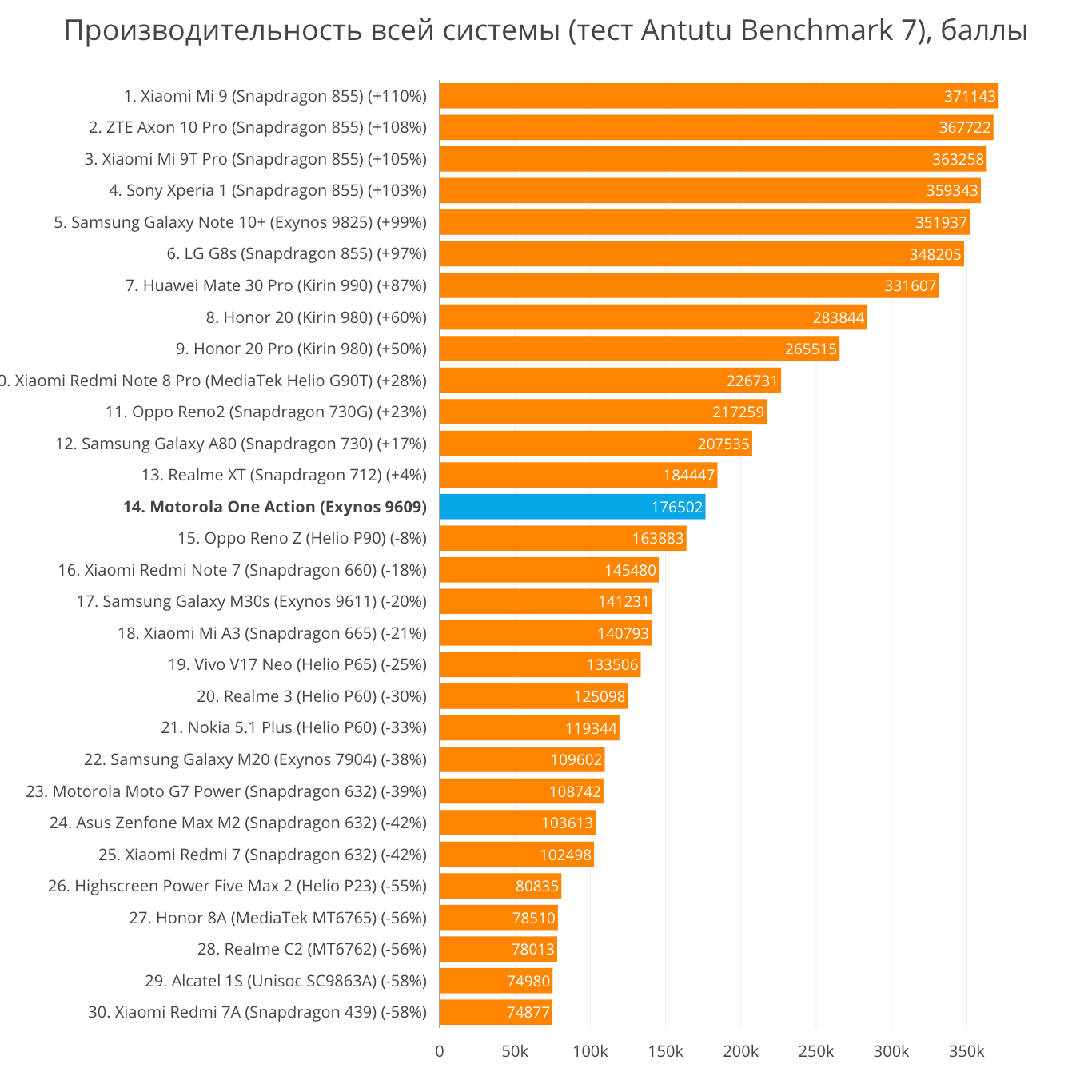 Ещё можно было бы сюда пришить хуавеевский Kirin 810, который чуть быстрее и при этом даже экономичнее, но Huawei намеренно не продаёт смартфоны с этим процессором в России и предпочитает ставить старый и более медленный Kirin 710? Почему? Потому что со старым процессором отлучённый от Android Хуавей может регистрировать в Google новые смартфоны под видом старых и продолжать использовать Google Play в новых моделях. С Kirin 810 это уже не прокатит, а продавать смартфоны без Гугла в России ребята из Huawei боятся больше, чем исключения из Компартии Китая. Короче, поэтому вроде бы не элитный с технической точки зрения процессор Exynos 9609 в Мотороле по-прежнему ого-го!