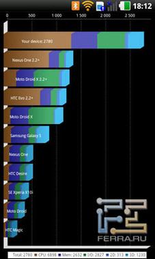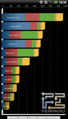 Для оценки быстродействия был запущен тестовый пакет Quadrant. Результаты нельзя назвать впечатляющим – 2000 баллов это в целом здорово, но при наличии двух ядер и мощного графического ядра можно было ожидать большего. Рекордсмен в лице Samsung Galaxy S II набирает без малого 3000 очков. Sensation показывает чуть лучший результат – около 2200 баллов. Ну а по представленным ниже диаграммам вы можете оценить разницу в быстродействии у прямых конкурентов: HTC Evo 3D и LG Optimus 3D.