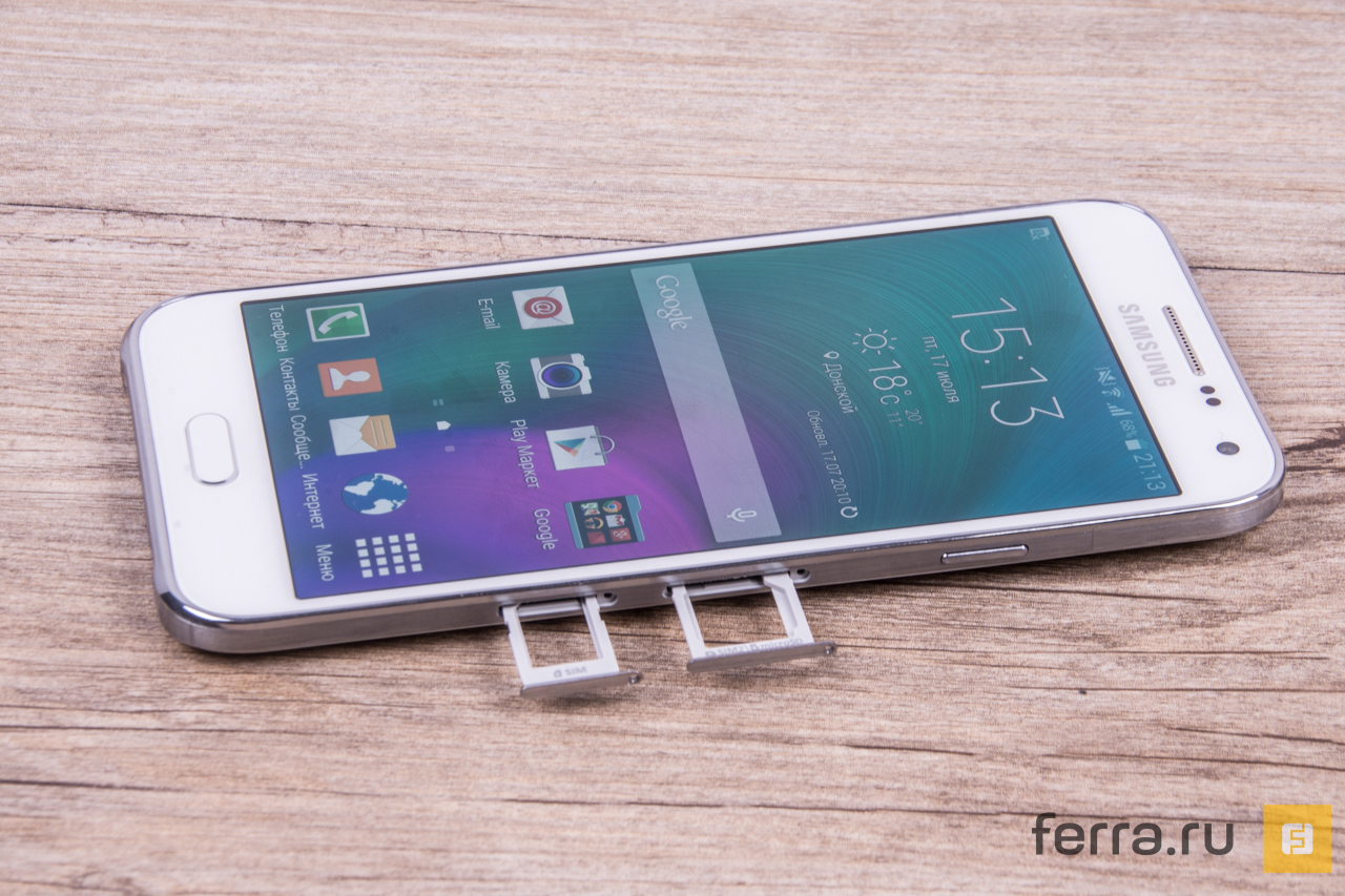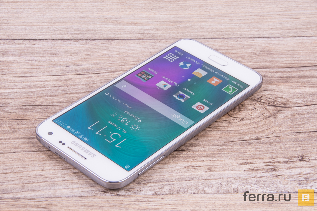 Правда, есть у Galaxy E5 и неприятные черты — сияющий пластик «под хром» на всех четырёх гранях на поверку оказывается довольно скользким, а класть смартфон дисплеем вниз чревато тем, что он на своём дисплее куда-нибудь самовольно «уедет», как это случается с Sony Xperia Z3, например.
