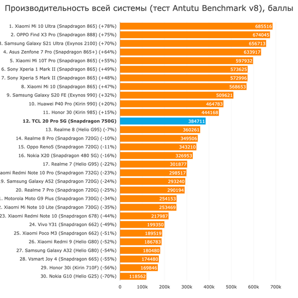 TCL 20 Pro 5G работает на процессоре Qualcomm Snapdragon 750G и имеет 6 Гбайт оперативной памяти. Как видно по тестам, этот процессор (точнее — система на чипе) чуть мощнее 730G и 720G, которые до сих пор используют конкуренты. При этом производительность GPU здесь на уровне MediaTek Helio G95 (если что, это хорошо — G95 у медиатека вообще отличным получился).