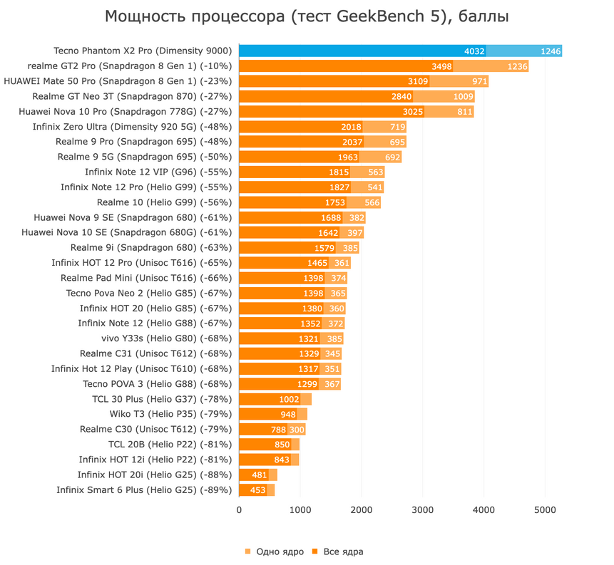 Автономность при этом получается чуть выше, чем у Realme GT2 Pro с тем самым 8 Gen 1. Разница как раз на уровне дополнительных 160 мАч аккумулятора (у Tecno Phantom X2 Pro ёмкость батарейки — 5160 мАч).