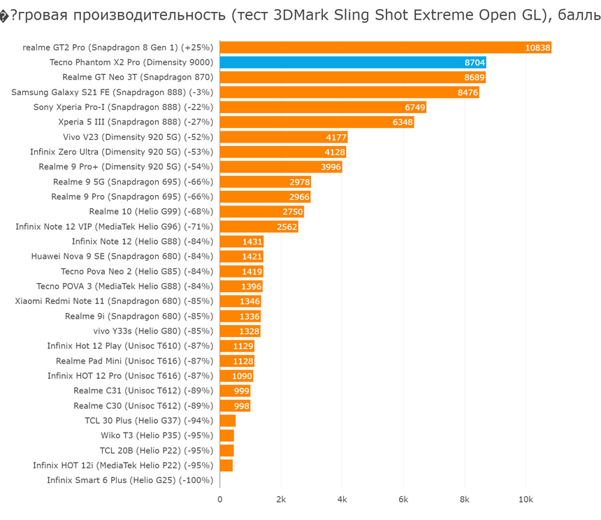 Нам ни разу в руки не попадался смартфон на топовом MediaTek Dimensity 9000. Вот сейчас попался и я под впечатлением: да, медиатековцы уже давно отошли от выпуска yблюдoчногo гoвнa наподобие Helio X10 и MT6589 к более цивилизованным процессорам. И да, я читал, что «Snapdragon уже не тот», а Dimensity 9000 — новый эталон в дорогих смартфонах. Но всё равно — вы только взгляните, как он «порвал» всех по CPU! Фактически он ближе уже к Snapdragon 8 Gen2, чем даже к 8+ Gen1 (разогнанной версии Gen1 на техпроцессе TSMC взамен Samsung). Но да, по графике он на четверть медленнее Снапа, поэтому не рассчитывайте, что 120 кадров в секунду у вас будут прям во всех играх. Но это ладно, это логично.
