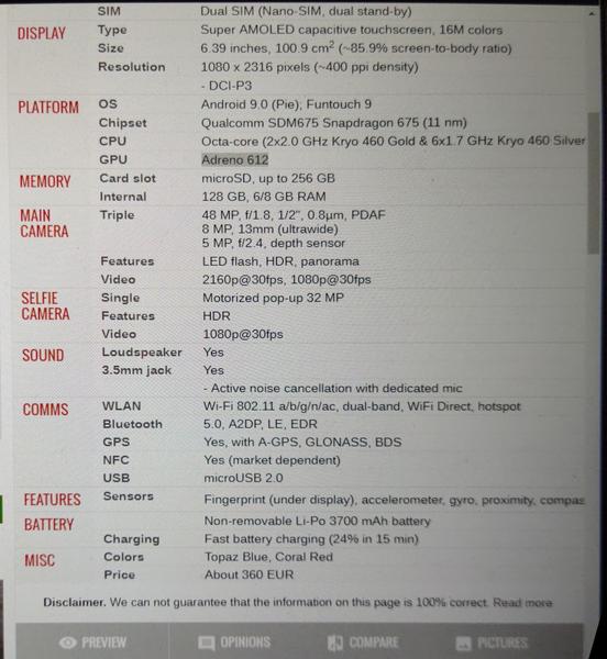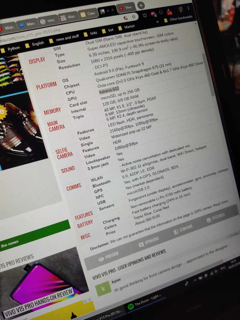 У Vivo V15 Pro хороший 6,4-дюймовый экран с AMOLED-матрицей, неплохой звук и даже остался порт для проводных наушников. Что немного досадно, остался и Micro-USB. Смартфон получил новейший чип Snapdragon 675, который по производительности в общих вычислениях находится на одному уровне с недавними лидерами в этой сфере. А вот графика ему досталась от чипа среднего класса, поэтому в игры играть можно, но не на максимальных настройках.