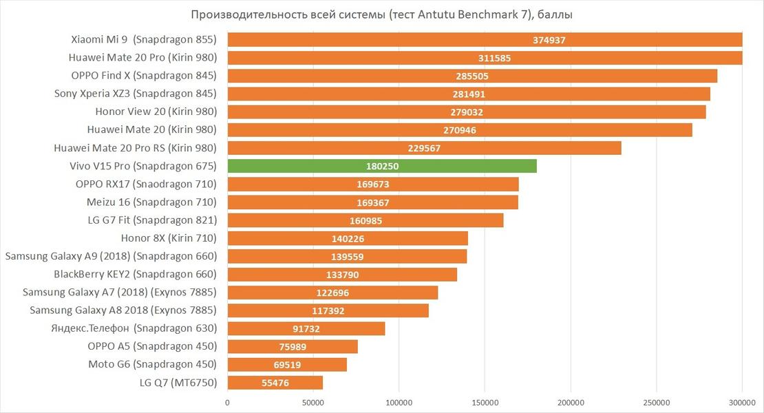По «железу» Vivo V15 Pro метит в ценовую категорию 35 тысяч рублей. Во-первых, у него стоит одна из самых свежих систем-на-кристалле — Snapdragon 675. И несмотря на то, что «шестисотые» у Qualcomm — это, традиционно, чистый средний класс без амбиций дотянуться до потолка, то конкретно 675-й в общих вычислениях показывает себя совсем не «средним». Он оставляет позади себя другую новинку Qualcomm — Snapdragon 710 (который, казалось бы, должен быть быстрее), а также позапрошлогодний топовый Snapdragon 835 и прошлогодний HiSilicon Kirin 970, и даже наступает на пятки Snapdragon 845. Правда, на фоне нового «топчика», Snapdragon 855, всё встаёт на свои места — последний чуть ли не вдвое быстрее.
