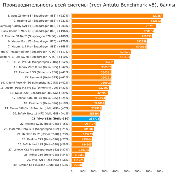 Смартфон Vivo Y53s (который без поддержки 5G, и который я тестировал) построен на процессоре MediaTek Helio G80. И для своей цены производительность у Vivo Y53s по итогу вполне адекватная.