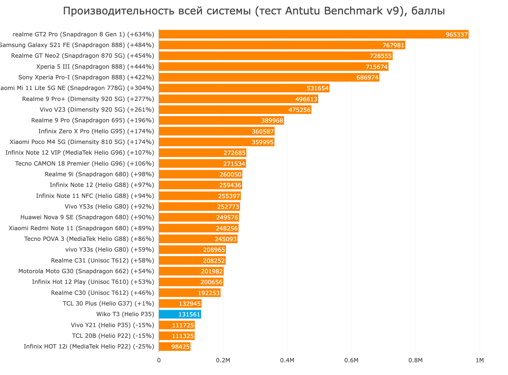 Я даже затрудняюсь сказать, какому современному процессору соответствует Helio P35 по производительности — ну не выпускают сегодня смартфоны с настолько медленными процессорами уже. Unisoc SC9863A, который все критиковали в Realme C11 2021 (смартфон стоимостью 7 тысяч рублей, на минуточку) — даже он быстрее на 30%! Если рассматриваем смартфон по аналогичной цене (даже чуть дешевле — 12 тысяч рублей против 13 тысяч за Wiko) — Realme C21Y с его Unisoc T610 — он быстрее на 42%.