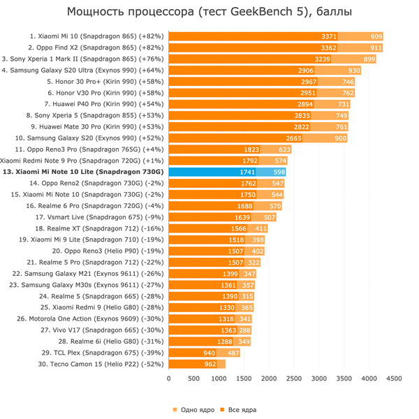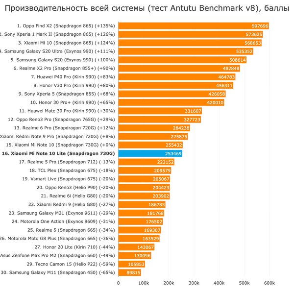 Сердце Mi Note 10 Lite — Qualcomm Snapdragon 730G. Это современный экономичный и довольно быстрый процессор для смартфонов среднего уровня. Относительно обычного Snapdragon 730 здесь чуть разогнана графика для улучшенной работы игр. Но это только в теории производительность вырастает на 15 процентов. В проведенных нами синтетических тестах, разницы со Snapdragon 730 почти нет. Тот же Samsung Galaxy A80 на базе этого чипа выдает похожие значения в бенчмарке, которым издавна принято измерять игровую производительность — 3DMark.