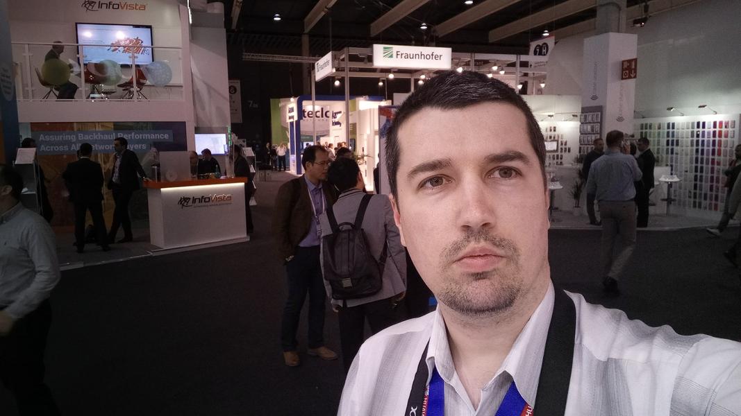 Фронтальная камера делает резкие и не шумные селфи даже в условиях странного освещения на выставке, но вот цветопередача получается какая-то эдакая — автор этой статьи не настолько бледный в жизни, как на тестовом фото.