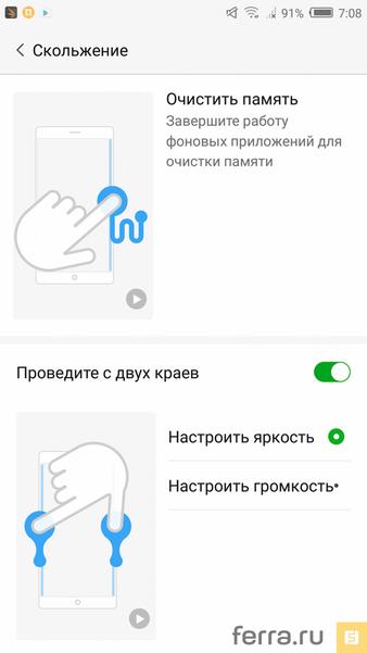 А ещё смартфон поддерживает хитроумные жесты: скольжением вдоль левой и правой граней можно переключать приложения или запускать новые. Не очень удобное занятие — всё-таки перед нами не S7 edge с его широкими «бёдрами» под такие забавы. Видимо, это понимают и в ZTE, потому что по умолчанию жесты в смартфоне выключены.