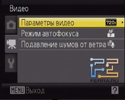 - Меню режима видеозаписи
