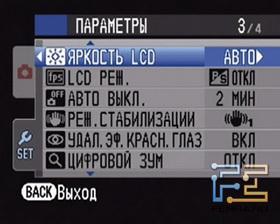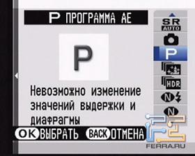 Поскольку камера очень простая, не стоит ожидать от нее широких возможностей по настройке экспозиции. Тут не предусмотрен даже выбор режима работы экспозамера, а установка экспопары производится либо в полностью автоматическом, либо в программном режиме. Второй отличается лишь тем, что вы можете ввести коррекцию экспозиции в диапазоне от -2 до +2 с шагом в треть ступени.