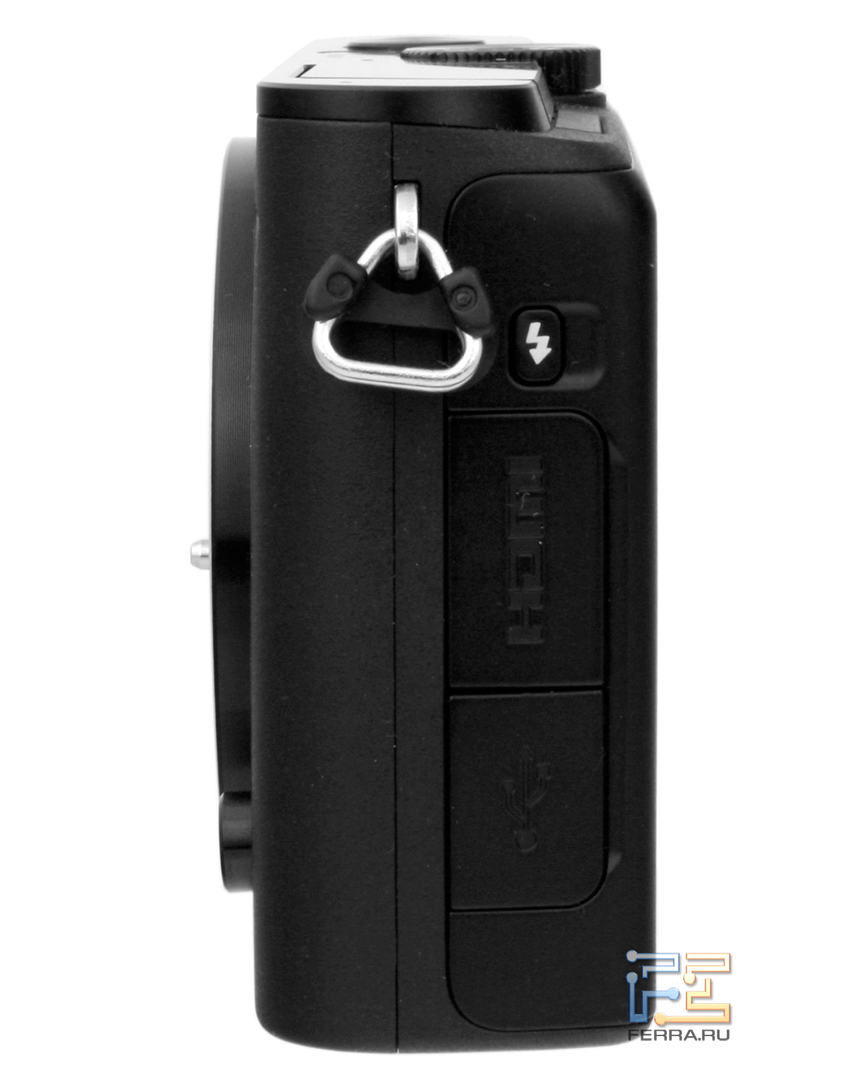 Правая боковая поверхность не особо загружена — тут находится только крепление ремня. Слева, помимо второго крепления, есть пара резиновых заглушек, скрывающих разъёмы подключения USB и HDMI-кабеля. Тут же находится и кнопка возведения вспышки. Стоит отметить, что вспышка теперь поднимается более привычном способом. В Nikon 1 J1 и J2 она выскакивала на длинной и тонкой пластиковой ножке, прочность которой оставляла желать лучшего.