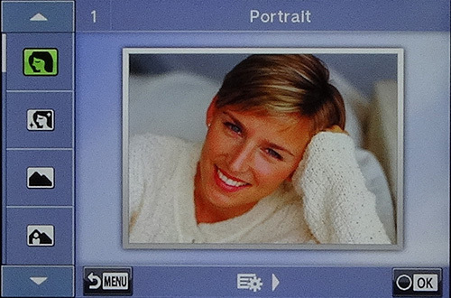 Программный интерфейс камеры требует отдельного рассмотрения. Реализован он достаточно грамотно и удобно. На дисплей во время съемки может выводиться подробная информация о большинстве настроек, причем эта информация не загромождает экран — все символы располагаются по периметру экрана на каждой из его сторон. Нажатие кнопки Info поочередно включает гистограмму, электронный уровень горизонта или активирует функцию подсветки слишком ярких участков кадра. При желании всю информацию можно полностью скрыть.
