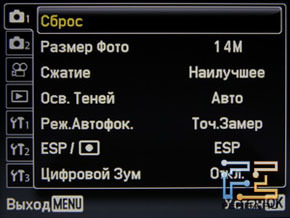 Меню практически такое же, как у большинства современных ультракомпактов Olympus; отличия заключаются лишь в наличии или отсутствии некоторых пунктов меню. Анимации в меню немного, к тому же она плавная и быстрая, поэтому желания её отключить не появляется.