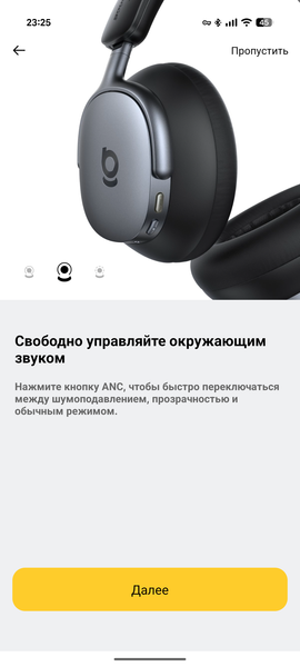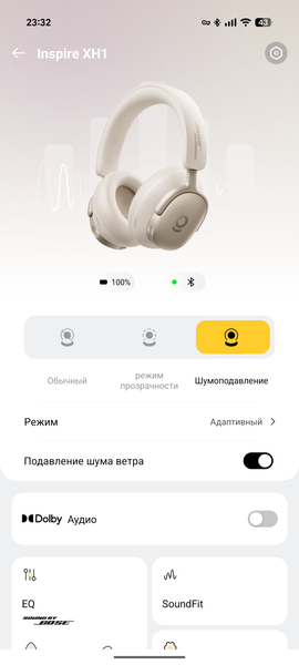 Приложение Baseus интуитивное, без лишних экранов. Главная страница показывает заряд батареи, активный режим шумоподавления, кодек подключения. Свайпом переключаешься между шумподавлением, прозрачностью и выключенным шумодавом. Отдельная кнопка включает Dolby Audio.