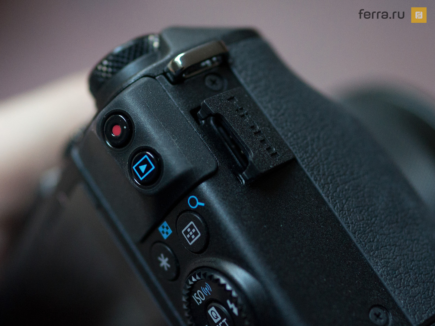 На левом торце размещен компактный рычажок для возведения вспышки. А также заглушка, скрывающая аудиоразъем и выход miniUSB (переходить на microUSB в компактных и беззеркальных камерах Canon почему-то не торопится). На правом торце можно заметить миниатюрную заглушку с выходом HDMI.