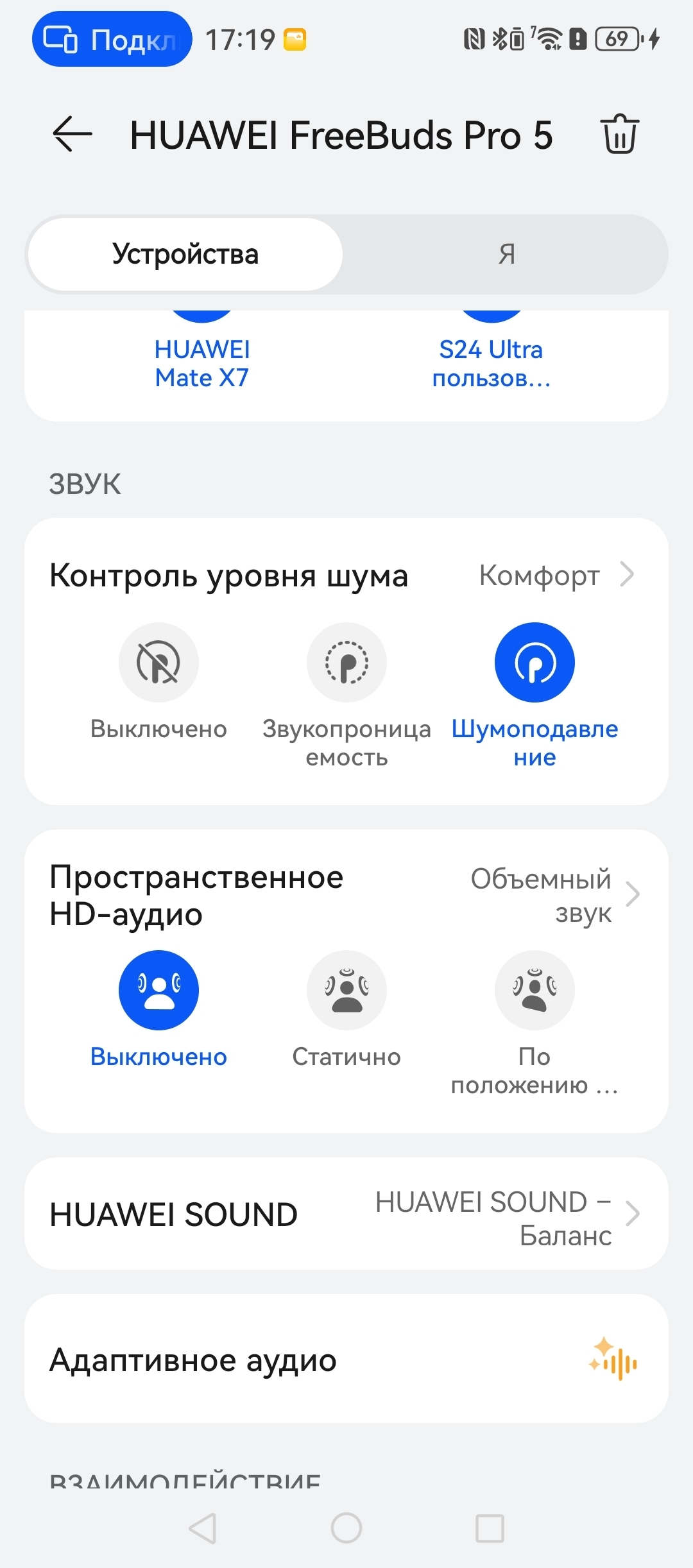 HUAWEI FreeBuds Pro 5 поддерживают подключение к двум устройствам, в приложении даже можно видеть, что это за устройства и выбирать приоритетное. Я подключил наушники к своему личному Samsung Galaxy S24 Ultra и к тестовому HUAWEI Mate X7, и когда во время прослушивания музыки с HUAWEI Mate X7 мне позвонили на мой самсунг, наушники автоматически переключились с музыки на входящий вызов.
