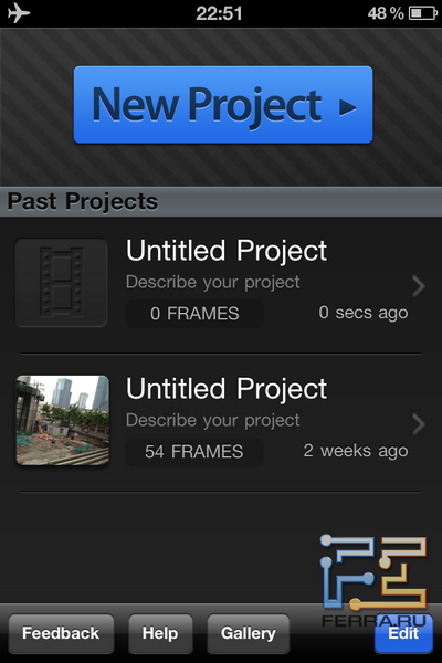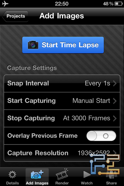 TimeLapse (AppStore, $1.99). Приложение, которое вплотную приближается к iTimeLapse Pro по функционалу. Интерфейс для съемки здесь мне нравится даже больше, однако организация меню может отпугнуть.