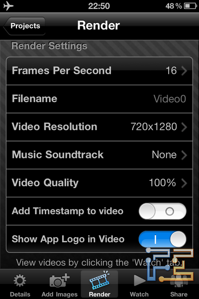 Чем больше размер исходных фотографий и чем выше разрешение видео на выходе, тем больше времени займет рендеринг. Данный ролик делался из 5-мегапиксельных фотографий на iPhone 4 с частотой 30 кадров в секунду при разрешении 960х640, которое соответствует экрану iPhone 4/4S. Рендеринг занял около 30 минут. iPhone 4S справляется с этим быстрее – примерно за 20 минут, даже с учетом того, что фотографии сохраняются в разрешении 8 мегапикселей.