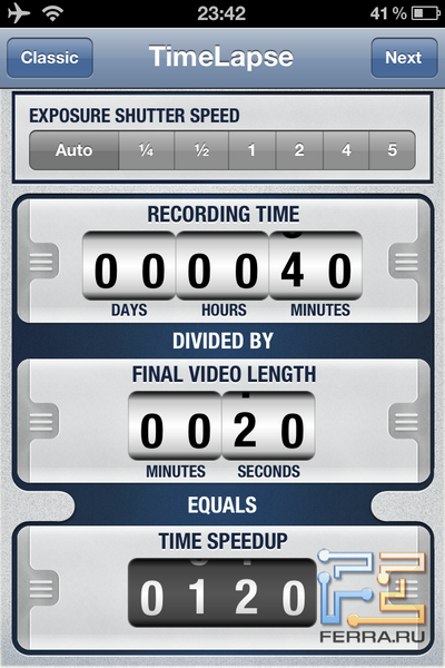 TimeLapse Photography (AppStore, $1.99). Очень напоминает вышерассмотренное приложение Time Lapse Camera. Разве что интерфейс избежал стилизации под компактную фотокамеру. Съемка начинается с задания интервала - он может быть любым, от одной секунды до нескольких часов. А вот видео генерируется автоматически.