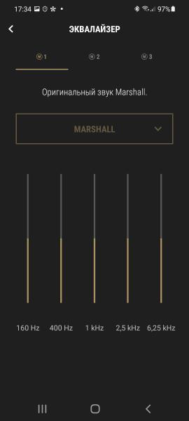 Здесь же имеется эквалайзер, правда, свободно настраивать его нельзя. У эквалайзера три переключаемых слота, в первом — только “оригинальный звук Marshall”, во втором и третьем можно выбирать из готовых пресетов.