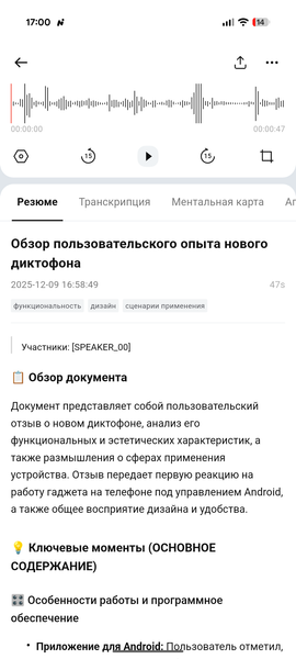 Да, заряжается не очень удобно, но это все еще удобнее, чем разблокировать телефон, перелистывать экран за экраном в поисках нужного приложения и потом ручками экспортировать нужные файлы. Тут же нажимаете на кнопку — он пишет. Нажимаете еще раз — обрабатывает. А через пару минут на экране смартфона появляется уже структурированный текст с тезисами, «майндмэпами» и возможностью задать уточняющие вопросы ИИ-ассистенту.