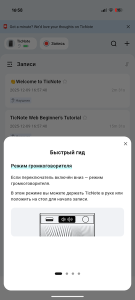 В реальных условиях это работает так. В тихой переговорной комнате TicNote улавливает речь даже с дальнего конца стола — слышно шепот, вздохи, паузы. В шумном кафе с громкой музыкой на фоне устройство справляется, но голоса звучат чуть приглушенно, а сам диктофон желательно класть ближе к говорящим. В метро или на оживленной улице качество падает существенно — тут уже не хватает направленности микрофонов.