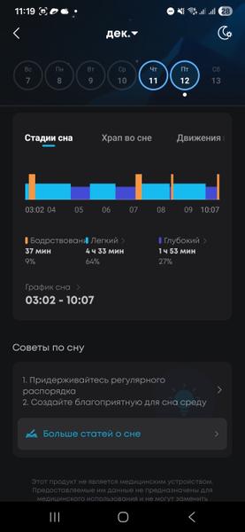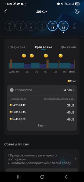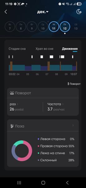 В-третьих, определяют, когда вы ворочаетесь во сне и в том числе показывают статистику, сколько вы спали на левом боку, сколько на правом, на спине, на животе.