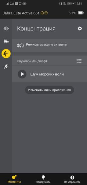Официальное приложение для работы с Jabra Elite Active 65t, понятное дело, играет роль центра управления вообще всеми их функциями. В боковом меню можно выбрать режим использования наушников. На выбор пользователю предоставляются четыре режима: «Мой момент», «В дороге», «Концентрация» и «Активный». В первом режиме можно настроить параметры звука при помощи простенького эквалайзера, либо выбрать одну из предустановок. Но самый интересный режим - «концентрация». Прямо из приложения можно включить фоновые звуки, которые призваны сконцентрировать ваше внимание при выполнении какой-нибудь рабочей задачи. Это может стать полезным в тех случаях, где уровень естественного фонового шум слишком высокий. Но не только этим богато приложение.