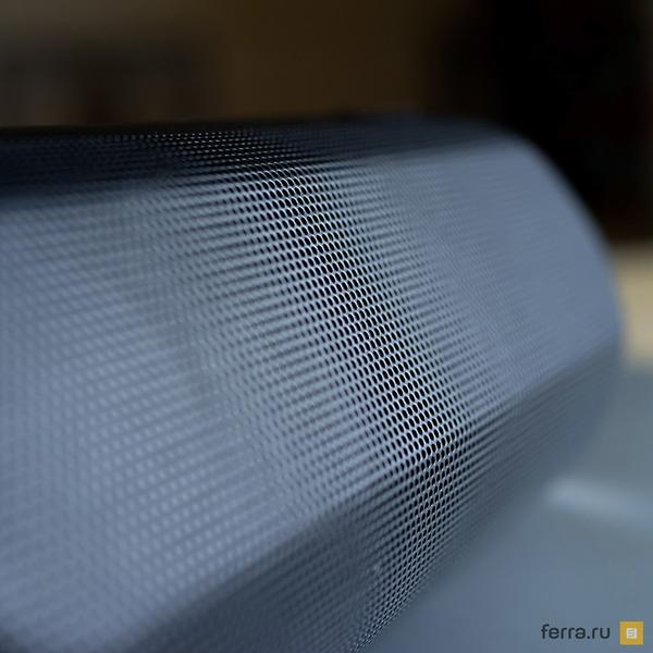 В деталях форма колонки очень сложна. В поперечном сечении по центру она похожа на многоугольник, а на торцах ее профиль становится идеально круглым. Если ставить ее горизонтально, динамики будут находиться на боковых гранях, а значит в центр комнаты или в середину стола ее лучше ставить именно таким образом. В вертикальном положении направленность звука немного меняется – такой формат скорее подойдет для прослушивания в одиночку.