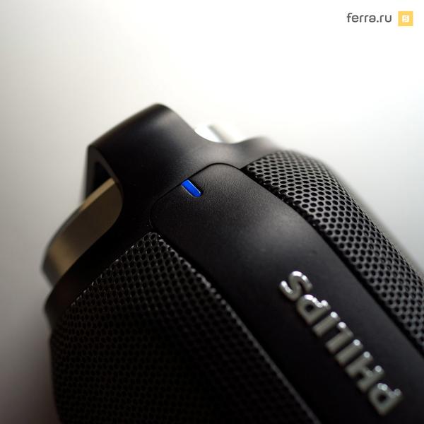 Еще на корпусе колонки можно заметить кнопку спикерфона и логотип NFC. О назначении этих элементов легко догадаться, но есть и необычные особенности. Но об этом ниже, а сейчас стоит добавить, что колонка защищена от пыли и влаги по стандарту IPX4. Ею можно без проблем пользоваться при высокой влажности (например, в душевой или даже в сауне), а также под слабым дождем на улице, но для подводных погружений Philips BT6600B не предназначена.